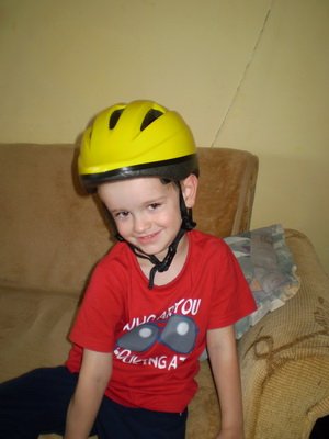 Jaj, és a fő lényeg, hogy a gyerek majd két napos folyamatos rimánkodás után megkapta a hőn áhított bicajos fejvédőjét, vagy ahogy ő mondaná, a „fejdőjét”. Az oviba látta egy kisgyereken és onnantól nem volt megállás. Persze apja szokás szerint elolvadt, ahogy meglátta, így aztán szombat este vett neki egyet. Az első 24 órába egyfolytában a fején volt, éjszaka is majdnem abba aludt, de sikeresen meggyőztük, hogy jobb helye van az ágya melletti kisasztalon. J Azóta is állandóan a fején van. J Jelenleg, térdvédőért (Pati szerint szélvédőért) és könyökvédőért könyörög. J Hát majd biztosan kap azt is, csak szépen kell az apára néznie, meg elszórnia egy-egy puszit az ősökre, de egyelőre én még ellenállok. J